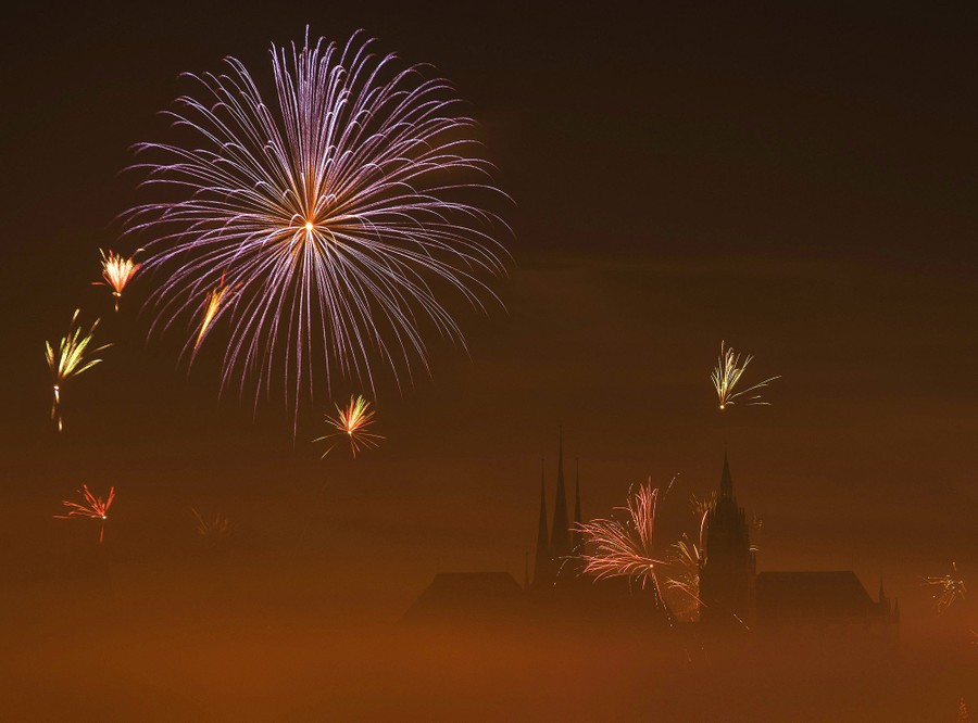 Read moreFireworks light the sky above the medieval Mariendom or St. Mary's Cathedral, right, and St. Severi's Church shortly after midnight during the New Year celebrations in Erfurt, Germany, on January 1, 2016. #