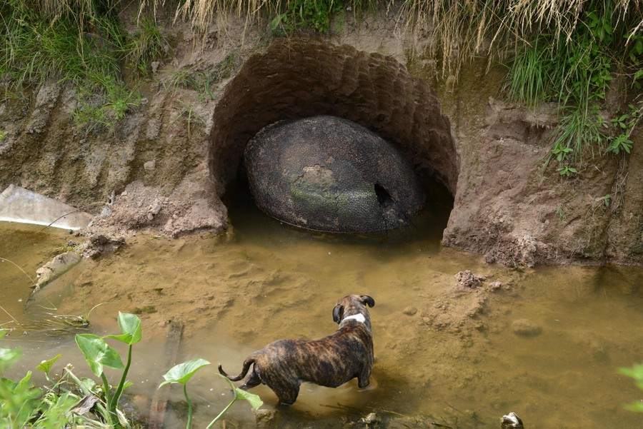 Read moreA dog wades in a stream beside the remains of a glyptodont shell found in Carlos Spegazzini, Buenos Aires Province, Argentina, on December 29, 2015. Glyptodonts were massive armored animals, related to modern armadillos, that went extinct during the most recent ice age. #