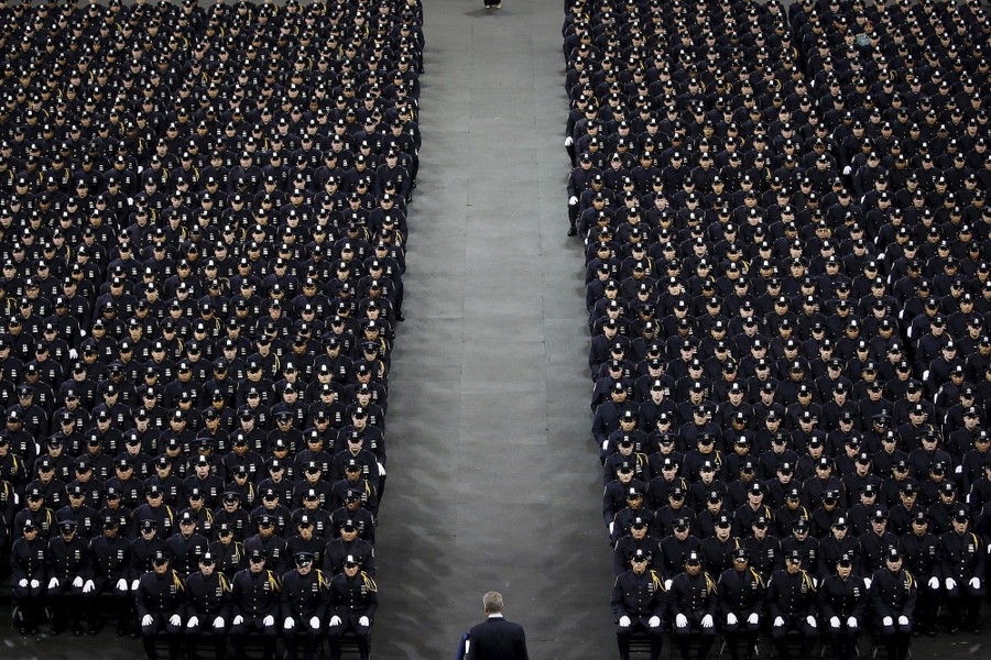 Read moreMayor Bill de Blasio speaks to police officers in New York City as they take part in a graduation ceremony at Madison Square Garden on December 29, 2015. According to de Blasio, 1,123 new officers graduated onto the force. #