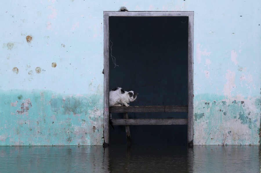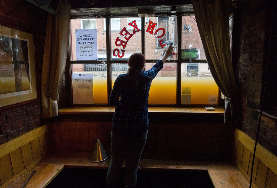 Read moreA woman cleans the inside window of her wine bar, as the floodwaters rise outside from the rivers Foss and Ouse, after they burst their banks in York, northern England, on December 28, 2015. #