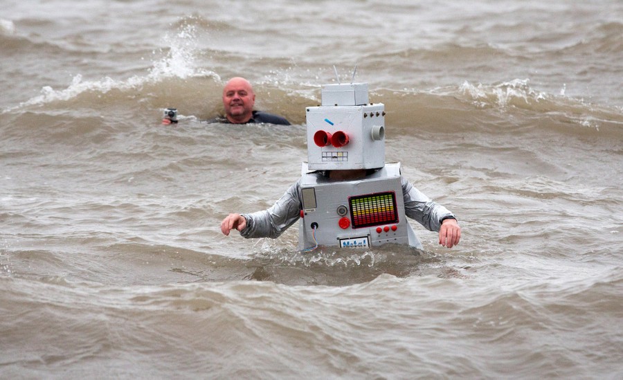 Read moreA man dressed as a robot paddles in the sea as he takes part in the annual New Year's Day swim at Barry Island as several hundred swimmers marked start of 2016 by taking a dip in the sea in Whitmore Bay on January 1, 2016, in Barry, Wales. Since 1984, when a group of five friends from the Jackson's Bay life saving club decided that they would shake off their New Year's hangovers with a swim in the sea, the annual swim has grown into one of the town's most popular calendar events. #