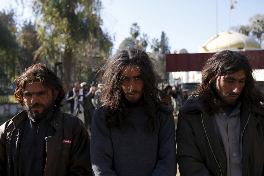 Read moreTaliban militants, who were arrested by Afghan border police, stand during a presentation of seized weapons and equipment to the media in Jalalabad on December 29, 2015. #