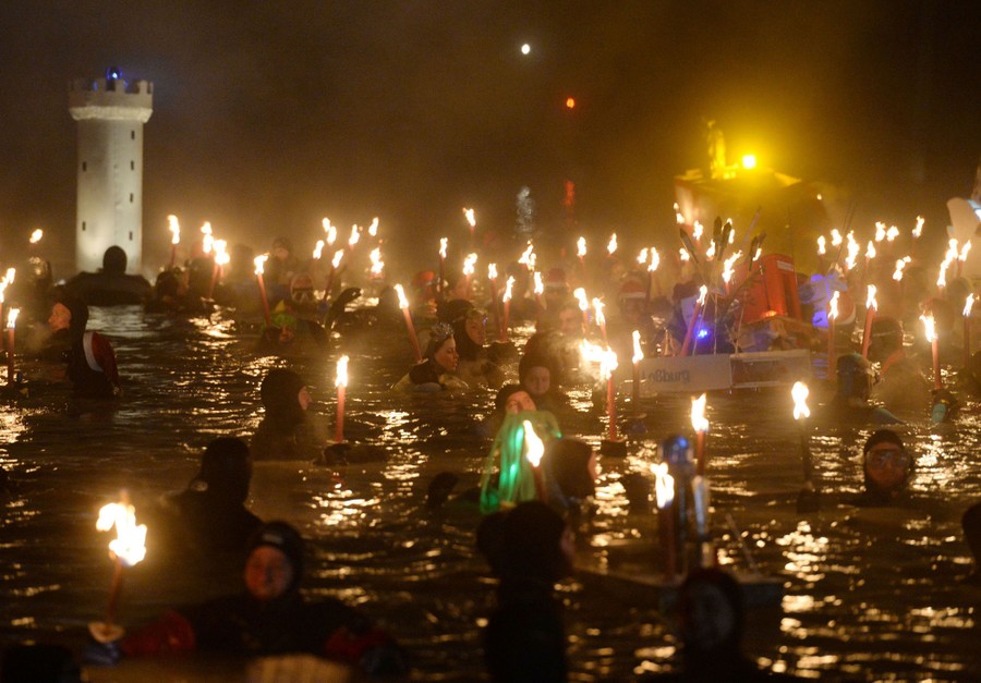 Read morePeople carry torches as they take part in the traditional new year's swimming event at the Bodensee (Lake Constance) in Constance, southern Germany, on December 28, 2015. #