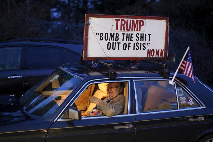 Read moreA man sits in a car with a sign on top, outside a campaign rally with U.S. Republican presidential candidate Donald Trump in Nashua, New Hampshire, on December 28, 2015. #