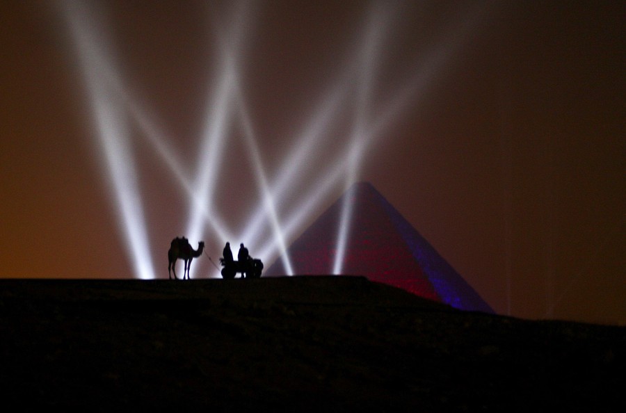 Read moreTwo Egyptian men and a camel stand on a hill overlooking one of the Giza Pyramids during a New Year's Eve fireworks display near Cairo, Egypt, at midnight on January 1, 2016. #