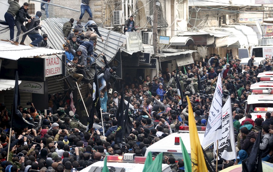 Read moreIn Gaza City, January 29, 2016, Palestinians fall from a collapsing shop roof, during the funeral of seven Hamas gunmen who were killed when a tunnel collapsed close to the Gaza Strip's eastern border with Israel. #