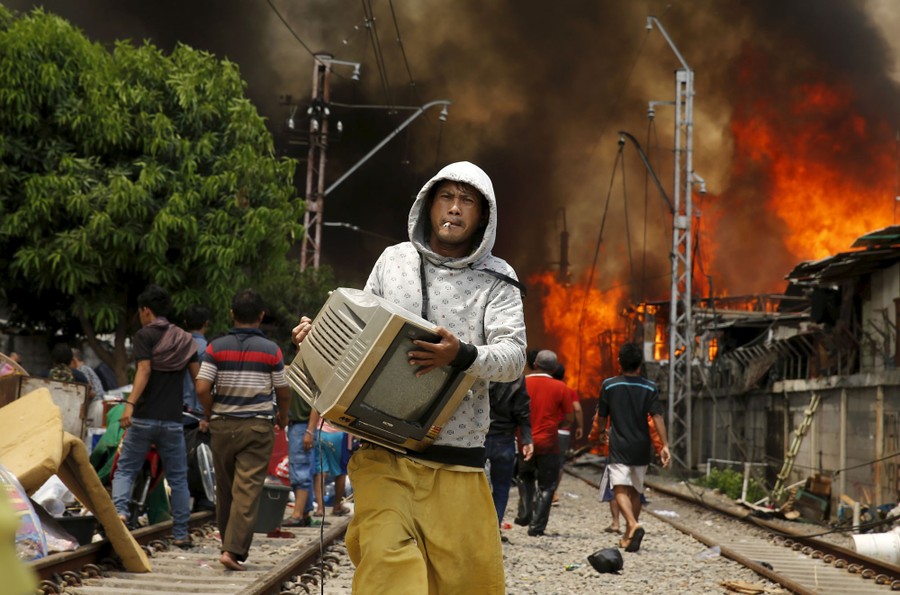 Read moreA man carries a television away from a fire in a slum area, next to railway tracks in Kampung Bandan, North Jakarta, Indonesia January 26, 2016. According to local media, the fire destroyed approximately 100 wooden dwellings, built along a busy railway line. No casualties were reported. #