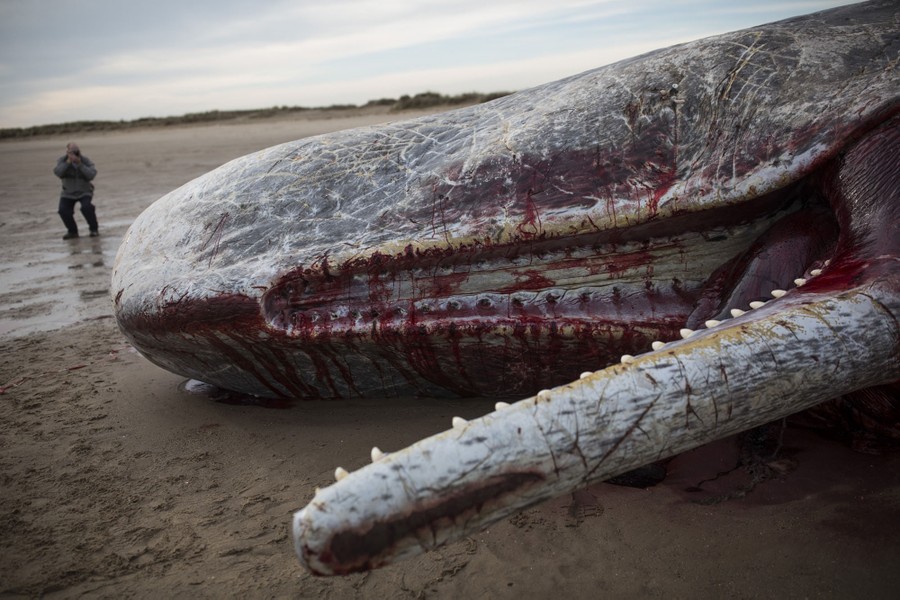 Read moreA member of the public takes a photograph of one of the three Sperm Whales, which were found washed ashore near Skegness over the weekend, as it lays on the beach on January 25, 2016, in Skegness, England. The whales are thought to have been from the same pod as another animal that was found on Hunstanton beach in Norfolk on Friday. #