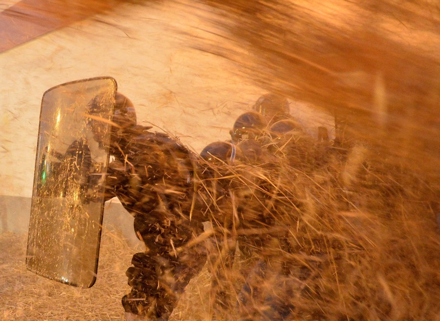 Read moreDuring a demonstration of farmers against falling prices of dairy and meat products, French riot police react as straw is blown at them from a straw spreader machine as they guard the entrance to a Carrefour hypermarket, in Le Mans, northwestern France, on January 27, 2016. Farmers unions are demanding distributors and major food companies pay more for produce and livestock. #