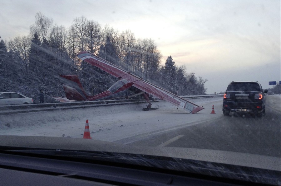 Read moreIn this picture taken through a car window, a single-engine plane lies on a highway after an emergency landing near the town of Sergiev Posad, about 60 kilometers (35 miles) north of central Moscow, Russia, on January 23, 2016. The aircraft made an emergency landing on one of the main highways leading out of Moscow, straddling the rail that separates north and southbound traffic. No injuries were reported in the Saturday afternoon incident. #