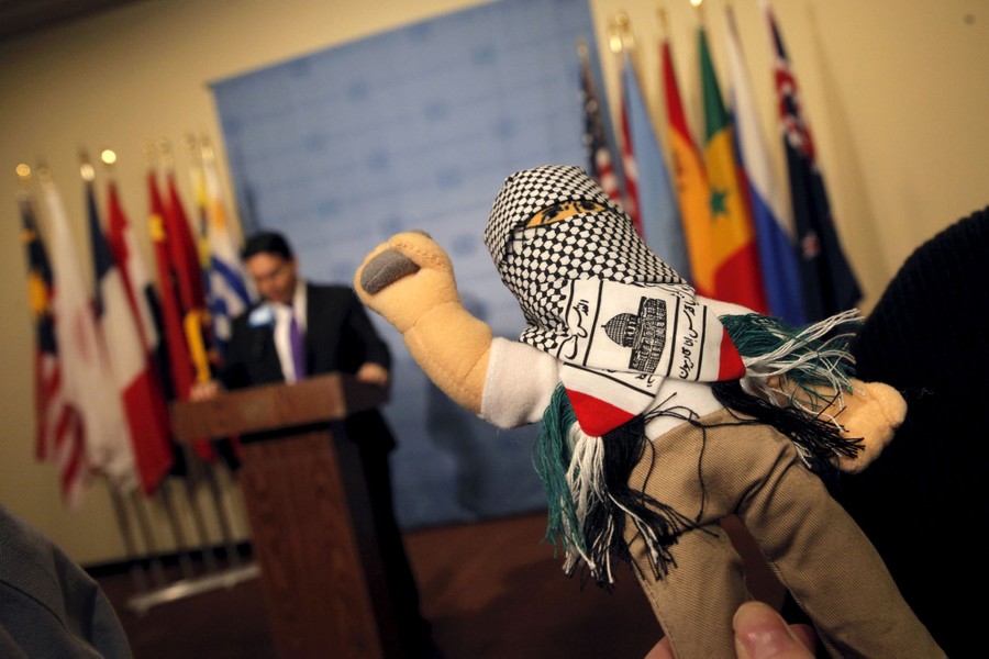Read moreIsrael's U.N. Ambassador Danny Danon (left) speaks during a press briefing, as a reporter holds a doll that Danon brought to the briefing that he said was part of a shipment that Israel recently stopped of “thousands of dolls dressed as terrorists, with stones in hand, destined for children in the West Bank,” before a United Nations Security Council meeting on the Middle East at U.N. headquarters in New York, on January 26, 2016. #