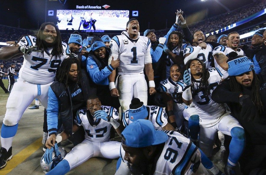 Read moreCarolina Panthers players celebrate during the fourth quarter, in a game against the Arizona Cardinals in the NFC Championship football game at Bank of America Stadium, on January 24, 2016. #