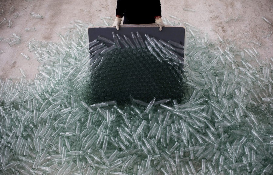 Read moreA worker breaks defective glass bottles to be recycled at the Phoenicia Glass Works factory in the southern Israeli town of Yeruham, on January 27, 2016. Factory workers grind these rejects into shards and pile them outside. #