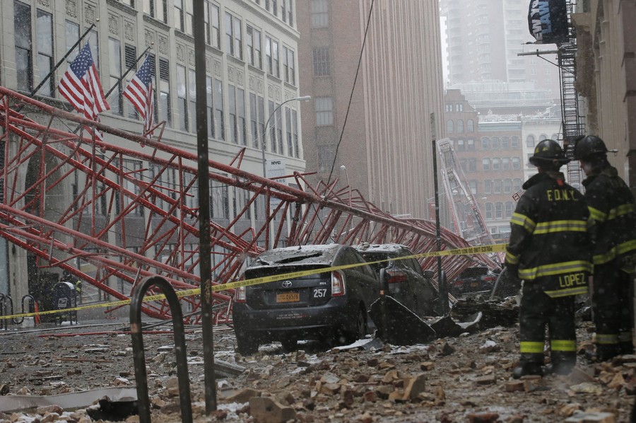 Read moreEmergency crews survey a massive construction crane collapse on a street in downtown Manhattan in New York on February 5, 2016. The accident killed at least one person and seriously injured two others, a spokesman for the New York City Fire Department said. #