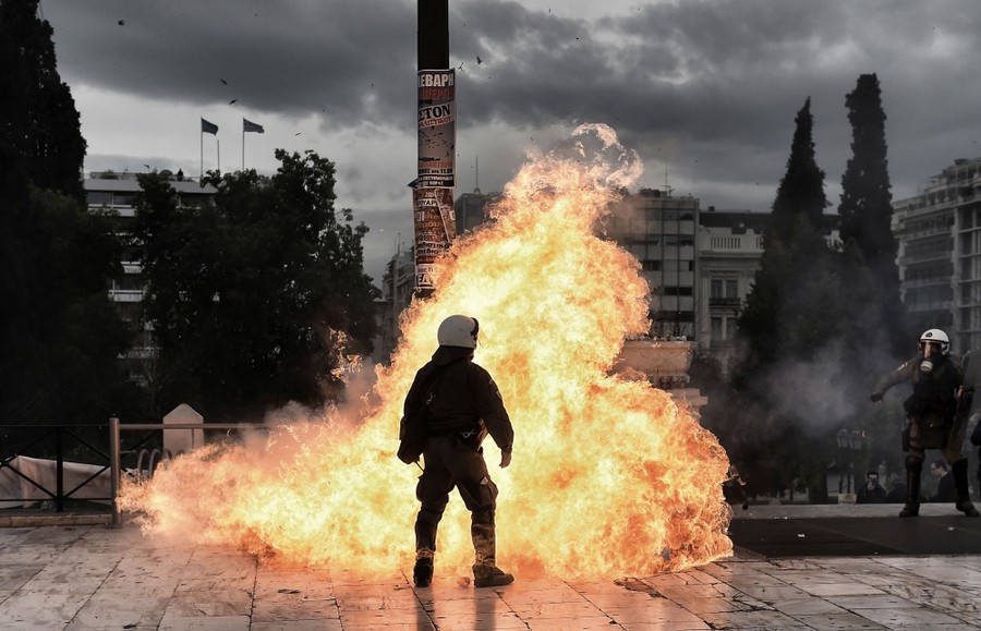 Read moreA firebomb explodes beside a riot police member during a massive protest on February 4, 2016. Thousands of people marched across Greece on February 4, 2016, as diverse classes united in a crippling general strike over a pension overhaul that has sparked a major backlash against embattled leftist Prime Minister Alexis Tsipras. #