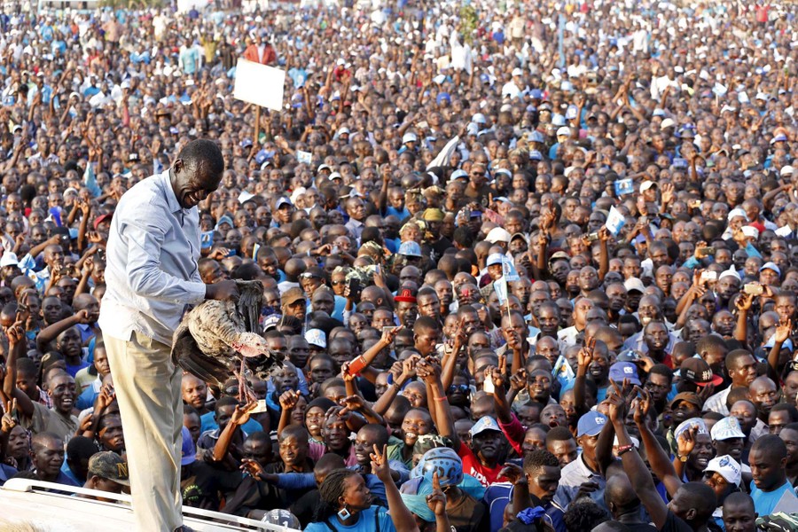 Read moreUganda's leading opposition presidential candidate Kizza Besigye of the Forum for Democratic Change (FDC) party receives a turkey from a supporter during campaign stop in Jinja, in eastern Uganda, on February 12, 2016, ahead of the February 18 presidential election. #