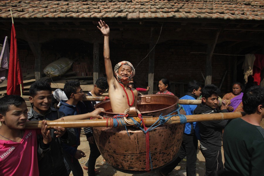 Read moreA Nepalese Hindu devotee sprinkles holy water as he is carried in a vessel during Swasthani Bratakatha festival in Lalitpur, Nepal, on February 19, 2016. During this festival, devotees recite holy scriptures dedicated to Hindu goddess Swasthani and Lord Shiva. Unmarried women pray to get a good husband while those married pray for the longevity of their husbands by observing a month-long fast. #