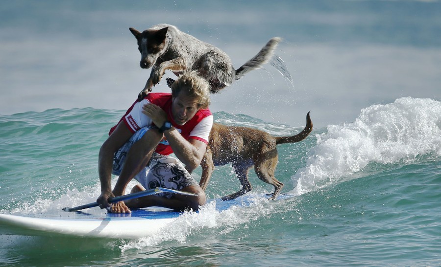 Read moreAustralian dog trainer and former surfing champion Chris de Aboitiz rides a wave with his dogs Millie (top) and Rama, off Sydney's Palm Beach, on February 18, 2016. #