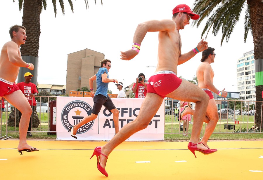 Read moreMen wearing high heeled shoes take part in a Guinness World Record attempt for the largest number of people running in high heels on February 14, 2016, in Melbourne, Australia. The World's Largest High Heel Race 2016 raised funds for the The Warwick Cancer Foundation. #
