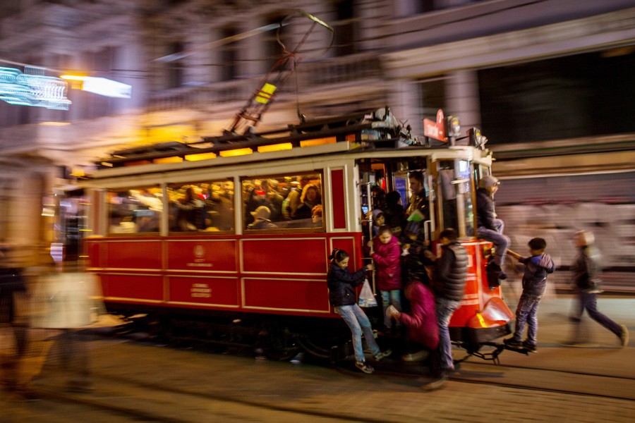 Read moreChildren ride on the outside of the Taksim-Tunel tramway as it makes its way down Istiklal Street on February 17, 2016, in Istanbul, Turkey. The traditional trams that serviced the famous shopping street were taken out of service in 1961 and replaced with buses. After Istiklal Street became a pedestrian street the trams were restored and reintroduced in 1990. Although popular with tourists the tramways are still used for commuting and allow people to avoid the steep walk from the Golden Horn to the top of Taksim Square. #