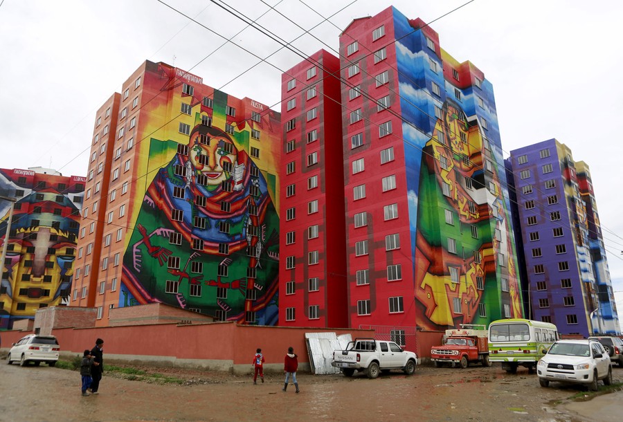 Read moreA view of multifamily buildings decorated by painter Roberto Mamani and built by a housing program of Bolivia's President Evo Morales' government in El Alto, on the outskirts of La Paz, Bolivia, on February 15, 2016. #