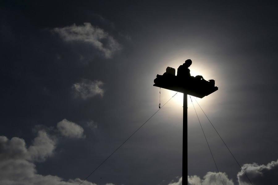 Read moreFrench art professor Abraham Poincheval sits on a ship mast platform in Rennes, western France, on February 16, 2016, where he plans to meditate and write on questions of perspective as part of an art installation. The platform is 12 meters high and the size of a single bed, and he brought food, clothes and a sleeping bag for his one-week stay. He has done similar performance art projects in and around small, unusual spaces. #