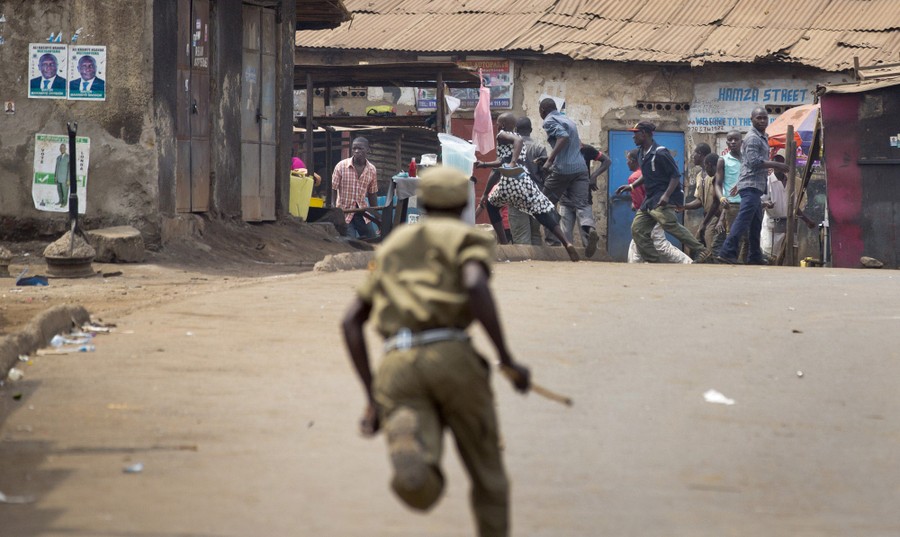 Read moreA policeman chases angry supporters of opposition leader Kizza Besigye, near his party headquarters, in Kampala, Uganda, on February 19, 2016. Police in Uganda arrested opposition leader Kizza Besigye at his party's headquarters Friday after heavily armed police surrounded the building and fired tear gas and stun grenades at his supporters who took to the streets. #