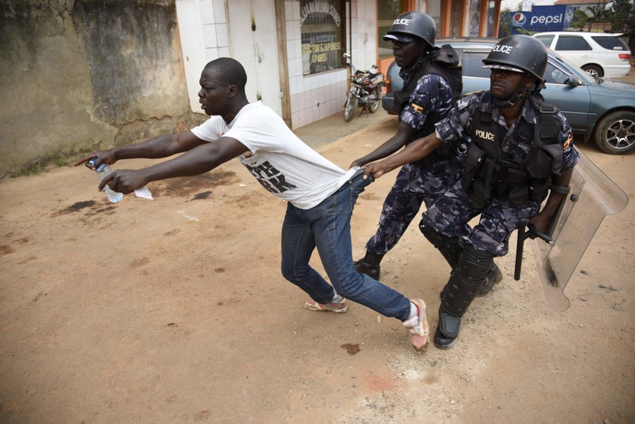 Read moreUgandan policemen arrest a protester on February 19, 2016, in Kampala as presidential and parliamentary votes were disrupted in the capital by the late arrival of ballot boxes and papers, angry demonstrations by frustrated voters, and police using tear gas. #