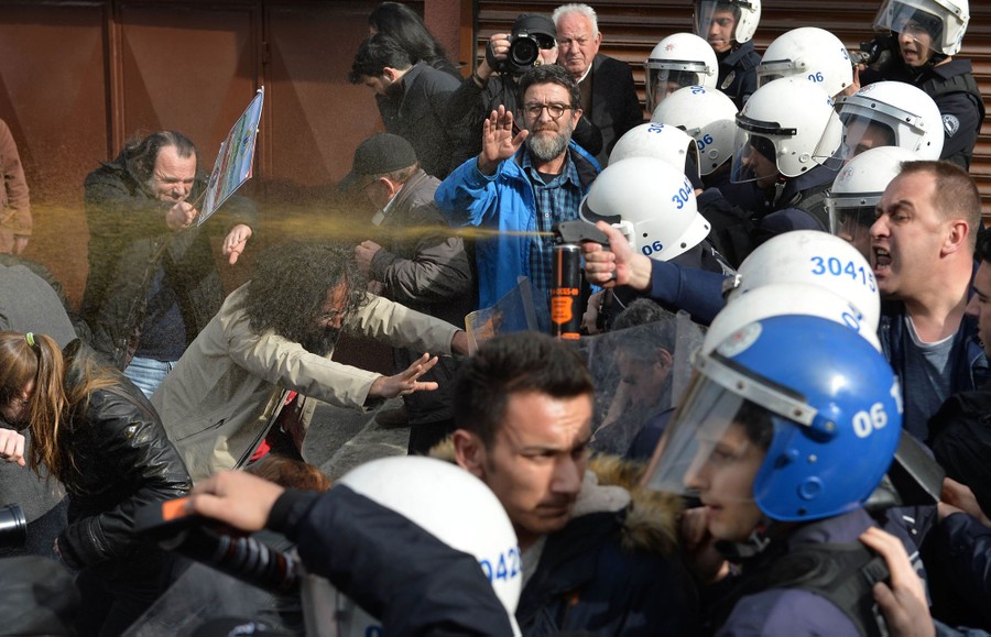 Read morePolice (right) spray tear gas to disperse hundreds of protesters trying to prevent a gold mine from being built in an ecologically pristine area in the Black Sea region, during a protest outside the premises of the Cengiz Holding conglomerate on February 17, 2016 in Ankara, Turkey. #