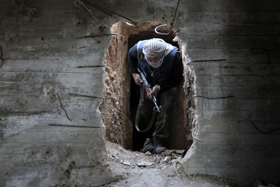 Read moreA Syrian rebel fighter from the Failaq al-Rahman brigade comes out of a hiding position on the frontline against regime forces in the town of Arbin, eastern Ghouta region, on the outskirts of the capital Damascus on February 26, 2016. #