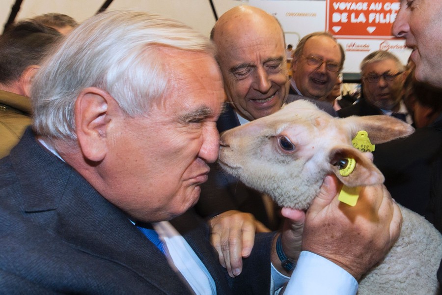 Read moreFormer French Prime Ministers Alain Juppe (rear center) and Jean-Pierre Raffarin (left), holding a lamb, visit the French annual farm show, Salon International de l'Agriculture, on March 3, 2016 in Paris. #