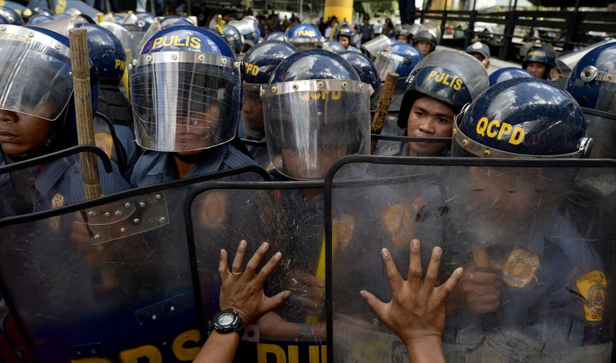 Read moreAn activist pushes the shields of policemen during a protest near the EDSA Shrine along a highway in Manila on February 25, 2016, commemorating the 30th anniversary of a bloodless popular revolt that ended the iron rule of late dictator Ferdinand Marcos in 1986. Philippine President Benigno Aquino urged voters on February 25 to stamp out the stunning political resurgence of Ferdinand Marcos' family, as the nation marked 30 years since a “People Power” uprising toppled the late dictator. #