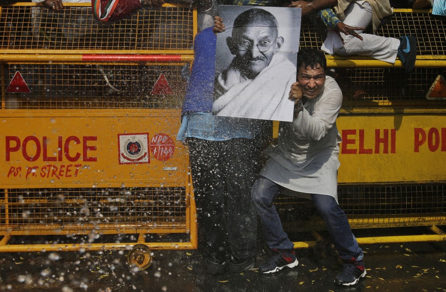 Read moreA supporter of the youth wing of India’s opposition Congress Party holds a portrait of the Indian independence leader and renowned pacifist, Mahatma Gandhi, as police use water canons to stop protesters from marching towards Indian Parliament during a protest in New Delhi, India, on March 2, 2016. The protest was against a statement given by Smriti Irani, India’s Human Resource Development Minister, in the Indian Parliament during a debate on recent student protests in the country. #