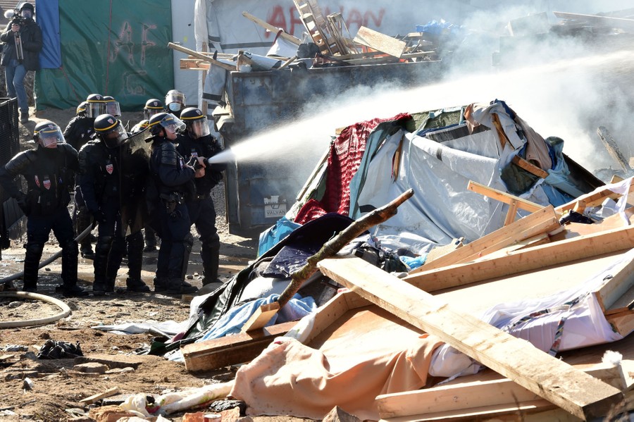 Read moreRiot policemen extinguish a fire during the dismantling of half of the “Jungle” migrant camp in the French northern port city of Calais, on February 29, 2016. Two bulldozers and around 20 workers began destroying makeshift shacks, with 30 police cars and two anti-riot vans stationed nearby. #