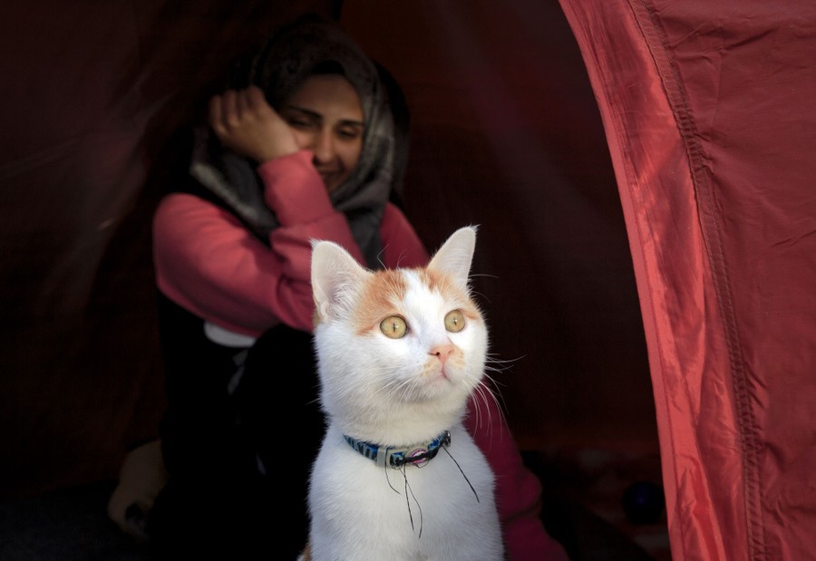 Read moreIsraa Abud smiles as her family cat Taboush peers from the tent in Idomeni, Greece, near the border with Macedonia, on March 6, 2016. Nearly 70 years after Israa Abud al Hosary’s grandparents fled Palestine, she is reliving their fate, forced to leave home with nearly nothing and start again from scratch in a foreign land. #