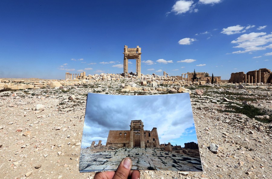 Read moreOn March 31, 2016, a photographer holds a picture of the Temple of Bel taken on March 14, 2014, in front of the remains of the historic temple after it was destroyed by ISIS jihadists in September 2015 in the ancient Syrian city of Palmyra. Syrian troops backed by Russian forces recaptured Palmyra on March 27, 2016, after a fierce offensive to rescue the city from jihadists who view the UNESCO-listed site's magnificent ruins as idolatrous. #