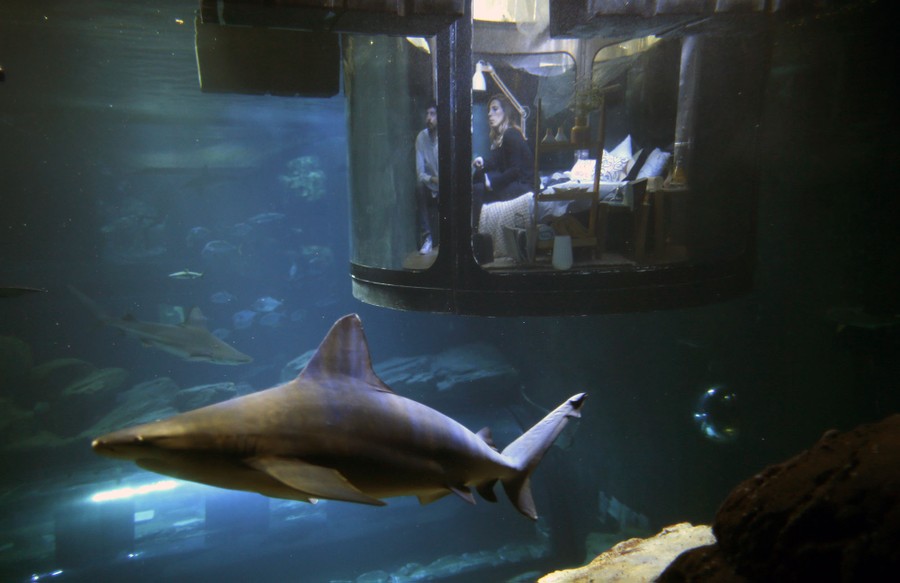 Read morePeople look at sharks from an underwater room structure installed in the Aquarium of Paris, France, on March 14, 2016. Airbnb and the Aquarium of Paris offered contest winners a night underwater sleeping with sharks and create a research platform for misunderstood shark species. #