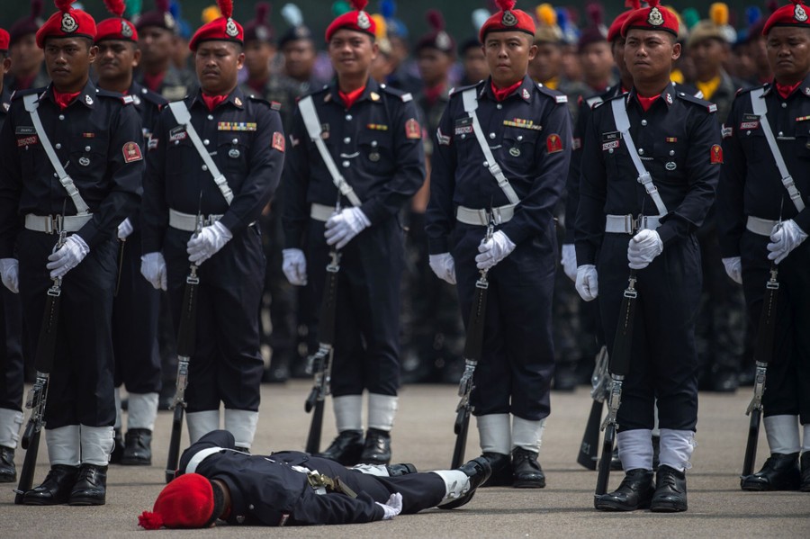 Read moreA member of the Malaysian Federal Reserve Unit lies on the ground after fainting due to the hot weather during the 209th Police Day parade in Kuala Lumpur on March 25, 2016. #