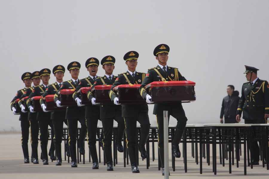 Read moreChinese honor guards carry caskets returned by South Korea containing the remains of Chinese soldiers who were killed during the 1950-1953 Korean War, at an airport in Shenyang, Liaoning province, on March 31 2016. #