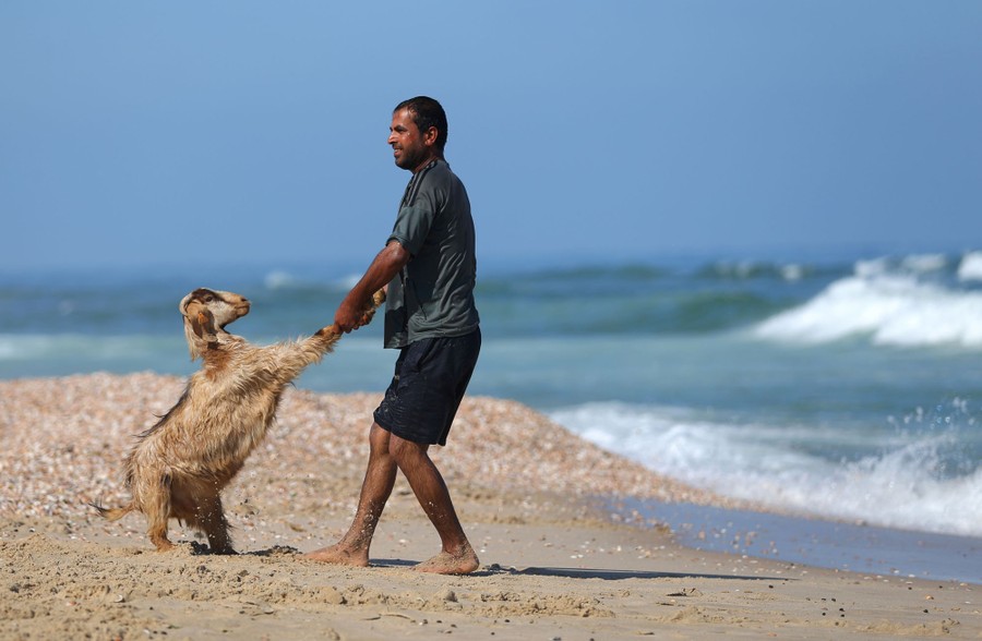 Read moreA Palestinian bedouin shepherd pulls a lamb into the water to wash it in Gaza City, on April 29, 2016. Every year before the beginning of the summer, shepherds wash their herds in the sea. #