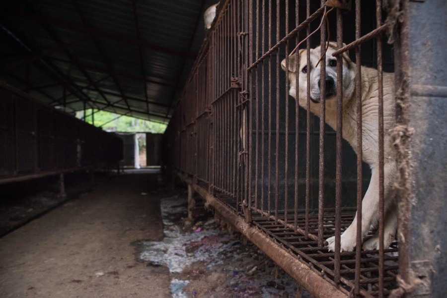 Read moreA dog looks out from a cage at a dog farm during a media visit organised by the Humane Society International in Wonju, southeast of Seoul, on April 27, 2016. The dogs were being transported to the US. The business was the fifth and the largest dog meat farm to be closed down by the Humane Society International. The dogs in the farm, one of thousands across the country, were bred specifically for consumption and confined in their cages from birth until slaughtered for their meat. South Koreans are believed to consume somewhere between 1.5 million and 2.5 million dogs every year, but the meat farming industry is in decline, with little demand among the younger generation. #