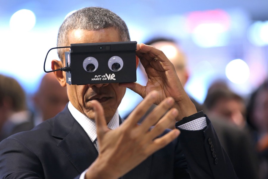 Read morePresident Barack Obama uses a Virtual Reality device next to the German Chancellor at the booth of the German automation company IFM Electronic, as the two toured the Hanover Industrial Fair in Hanover, Germany, on April 25, 2016. #