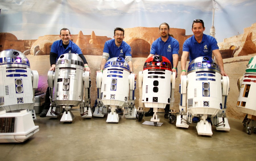 Read moreFrench members of the R2 Builders Club, pose with their own replica R2 robot from the Star Wars universe on display at the Paris Comics Expo at the Parc Floral in Paris, France, on April 15, 2016. #