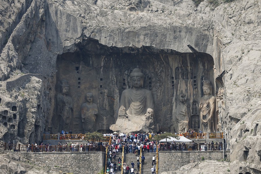 Read moreTourists view Buddhist sculptures at Longmen Grottoes on April 10, 2016, in the outskirts of Luoyang of Henan Province, China. Longmen Grottoes comprises more than 2,300 caves and niches carved into the steep limestone cliffs over a 1-kilometer-long stretch, containing the largest collection of Chinese art of the late Northern Wei and Tang Dynasties (316-907). #