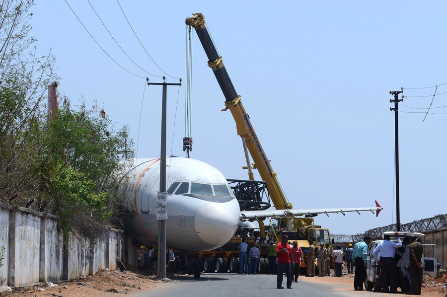 Read moreIndian police and rescue officials gather in front of a disused Air India passenger plane which fell from a ground transporter while being moved near Begumpet Airport in Hyderabad on April 10, 2016. The Airbus A-320 was being shifted from the airport to Air Indias cadet training facility,a crane mounted on a 16-wheelbase transport carrier toppled under the weight of the plane, dropping the aircraft on a wall nearby. Police and airport officials confirmed no one was injured in the incident. #