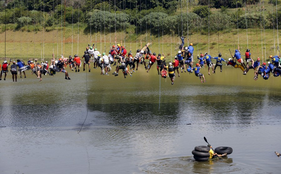 Read morePeople swing from ropes after jumping off a bridge in Hortolandia, Brazil, on April 10, 2016. According to organizers, 149 people were attempting set a new world record for ‘rope jumping.’ #