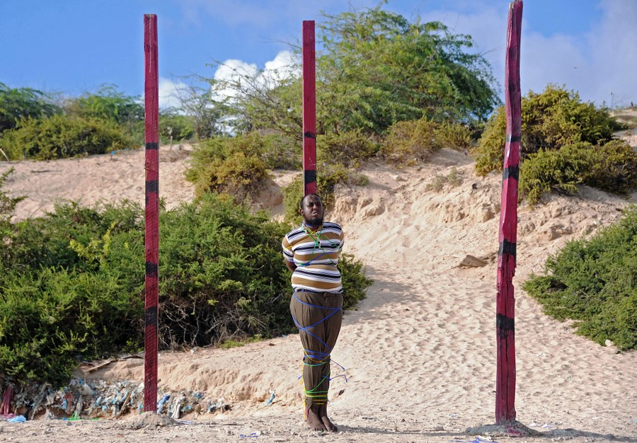 Read moreThe journalist Hassan Hanafi, convicted of murdering colleagues for the Al-Qaeda-linked Shebab jihadist group, is tied to a wooden post before being executed by firing squad at a police academy square in Mogadishu on April 11, 2016. Hassan Hanafi, was sentenced to death last month after military judges said he had confessed to his role in the killing of five journalists after being arrested in August of 2014 in Kenya and extradited to Somalia. #