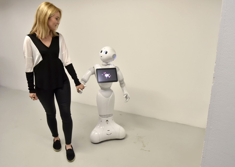 Read moreA press officer poses with Pepper the humanoid robot at the ‘World of Me: Store of the Near Future’ installation in London, on April 13, 2016. The robot is the first humanoid robot capable of recognizing principal human emotions and adapting his behavior accordingly. #