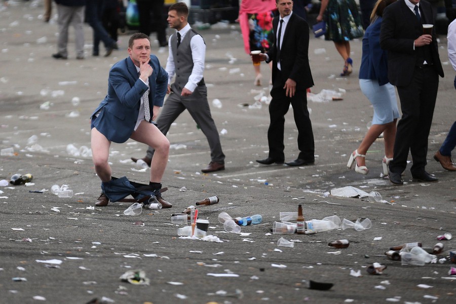Read moreA man plays to the cameras as racegoers make their way home at the end of Ladies Day the second day of the Aintree Grand National Festival meeting on April 8, 2016, in Aintree, England. #