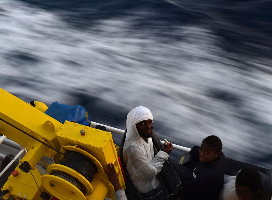 Read moreMigrants chat before spending the night aboard the rescue ship “Aquarius,” on May 25, 2016, a day after a rescue operation of migrants off the Libyan coast. A 21-year-old Cameroonian woman gave birth to a little boy as the Aquarius headed to the Sardinian port of Cagliari with 385 migrants on board. #
